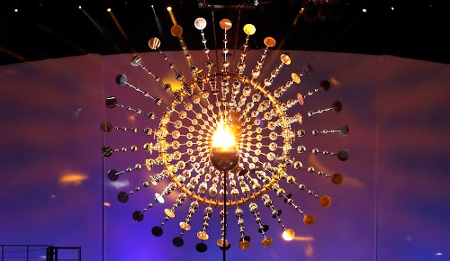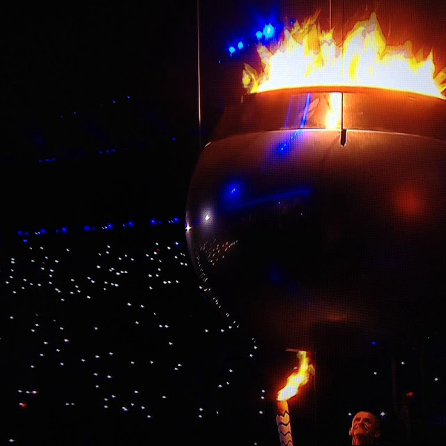 A tocha Olímpica é levada por Guga e Hortência até Vanderlei Cordeiro de Lima, para acender a pira, esta que se transformou em um maravilhoso sol.