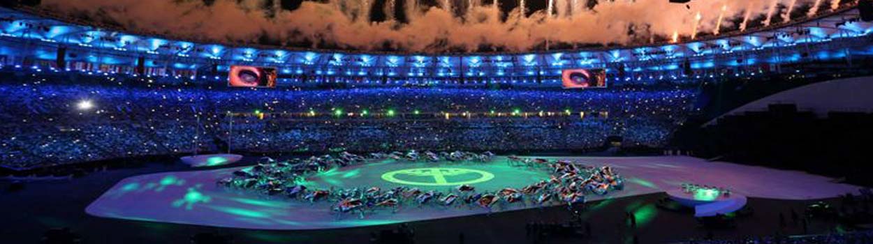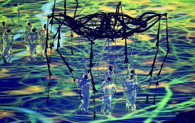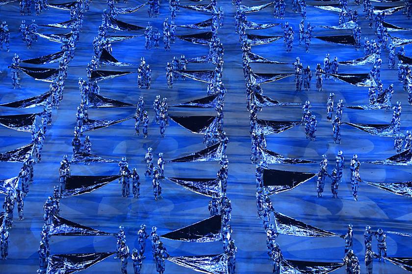 O campo do Maracanã foi transformado em um grande palco onde foi projetado imagens que se modificavam de acordo com a história contada. A cerimonia começa contando sobre o início de tudo, a forma como a vida começou, dos micro-organismo, bactéria e etc.