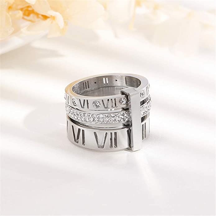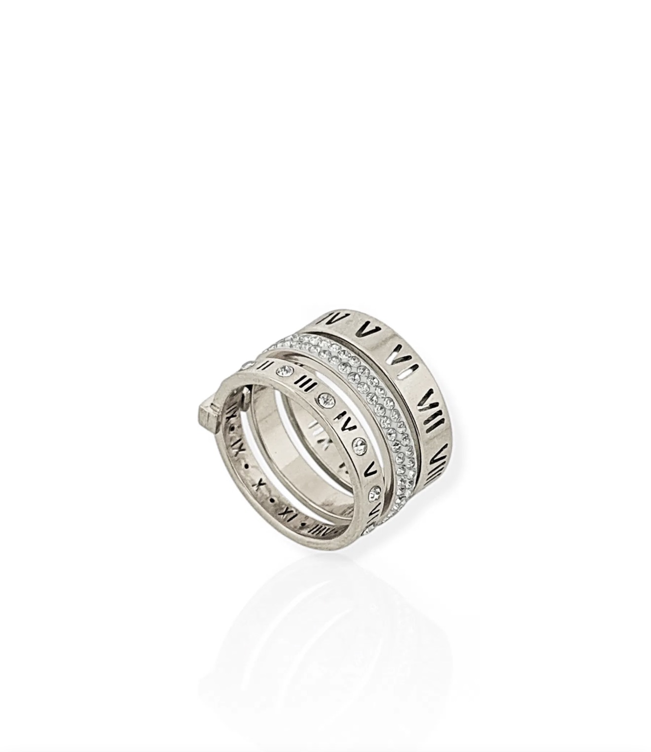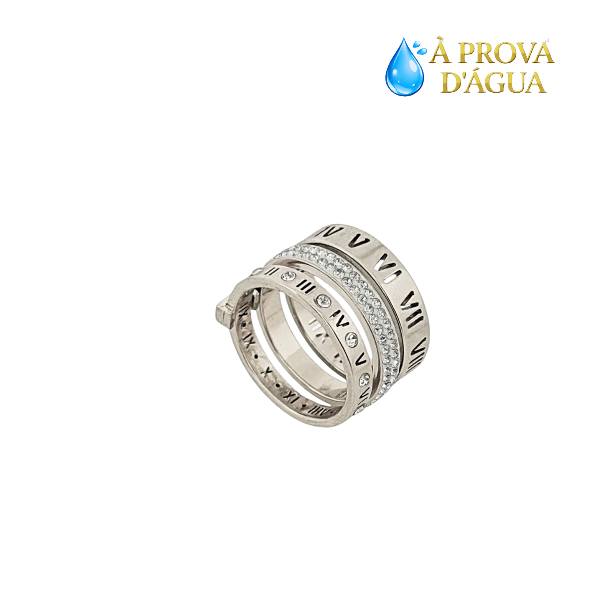 No centro do anel, uma fileira contínua de pedras claras cravejadas adiciona brilho à peça e cria contraste com as superfícies lisas do metal. Acima e abaixo dessa faixa, as gravações em números romanos percorrem toda a circunferência do anel, reforçando a identidade estética inspirada na simbologia do tempo.