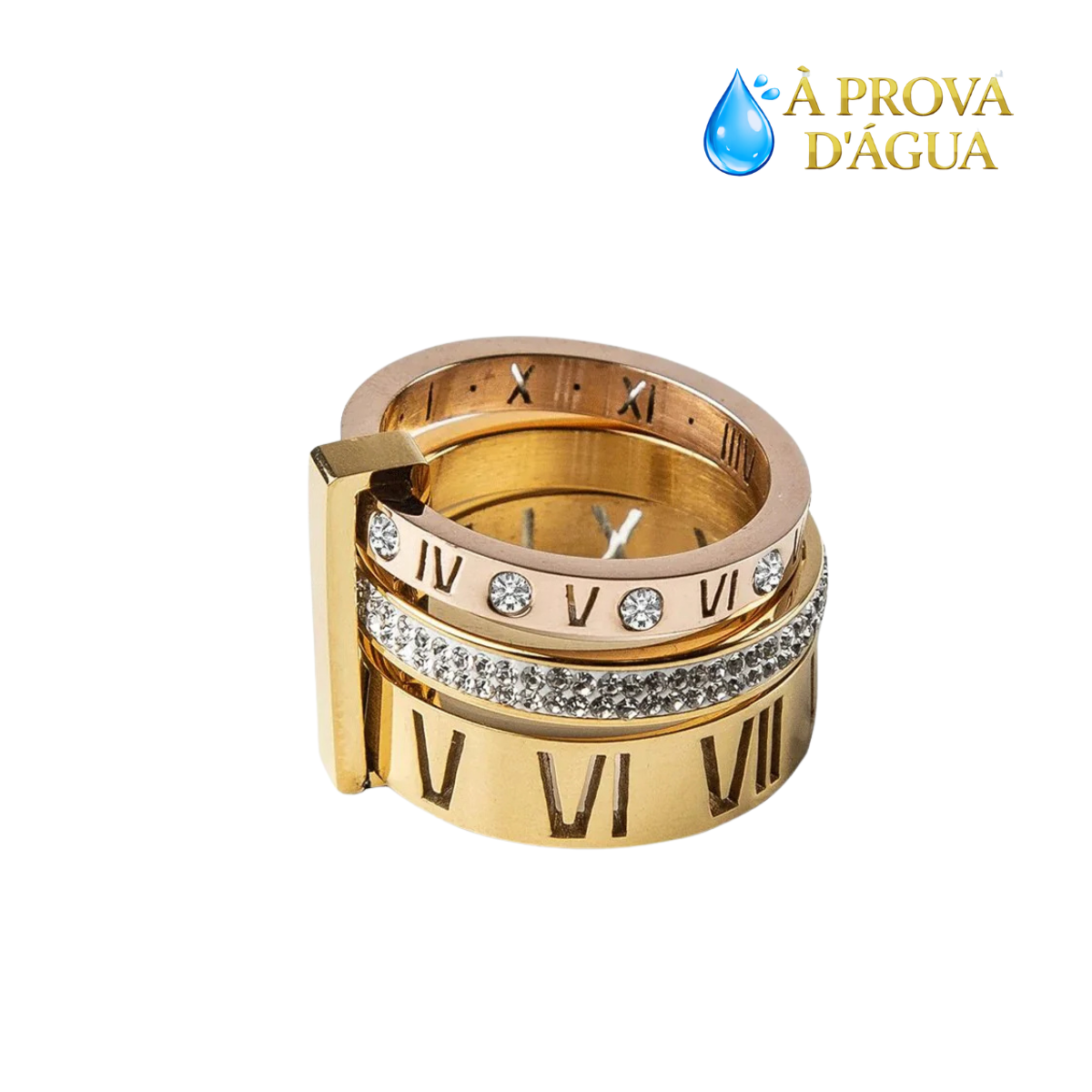 O Anel Imperium apresenta um design marcante e contemporâneo, composto por diferentes camadas que se sobrepõem de forma harmoniosa. A peça possui acabamento dourado polido e estrutura mais larga, criando presença visual e destacando a gravação em números romanos ao redor do aro, elemento que traz uma referência estética clássica ao design.