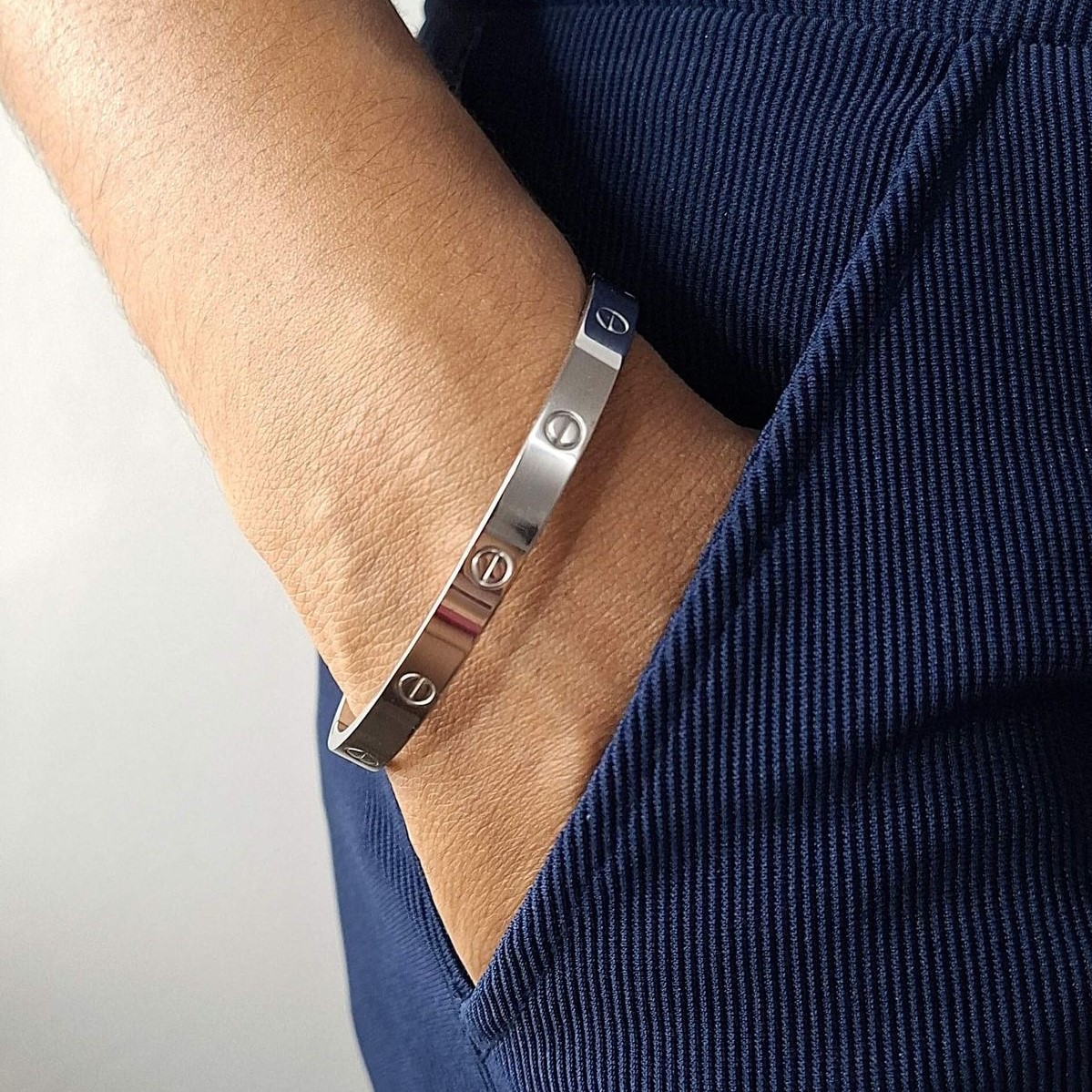 O Bracelete Orion Prateado apresenta um design contemporâneo com linhas limpas e acabamento polido que destaca a estética minimalista da peça. Sua estrutura rígida cria uma silhueta elegante no pulso, valorizando a simplicidade sofisticada do bracelete.