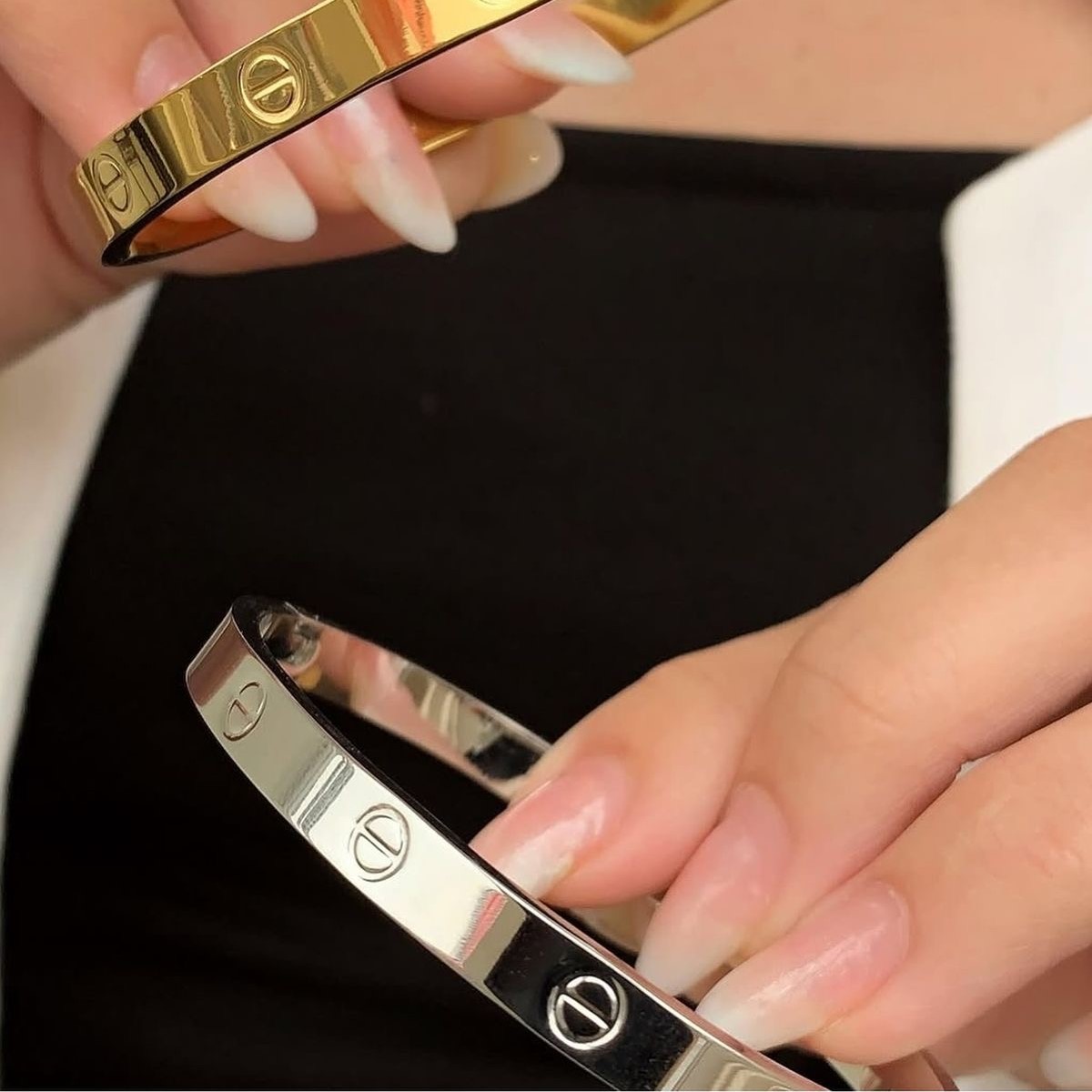 A estrutura rígida proporciona um encaixe firme e confortável no pulso, enquanto o sistema de abertura integrado facilita o uso e mantém a continuidade visual do bracelete quando fechado.